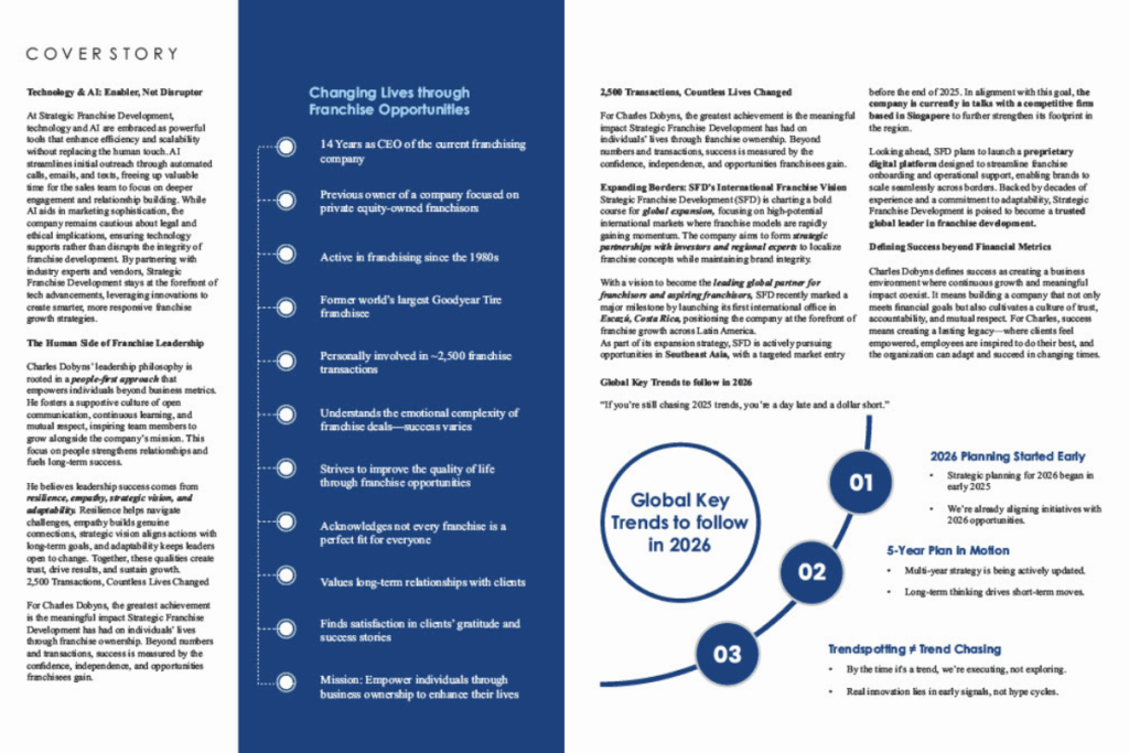 Strategic Franchise Development is proud to share that our CEO, Charles Dobyns, is featured in the Innovation Issue of The Enterprise World Magazine, recognized for his visionary leadership and transformative impact on the global franchise industry.